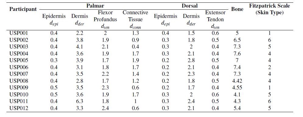 'ultrasound imaging', 'Monte Carlo computer simulations', 'skin anatomy', 'chromophores', 'scattering properties', 'absorption properties', 'photon transport', 'Muscle', 'Bone', 'Epidermis', 'Dermis', 'tendon', 'TracePro', 'Simulation and Modelling', 'Applied Physics', 'Human Biophysics', 'Biological Physics', 'Medical Physics', 'Radiology and Organ Imaging'